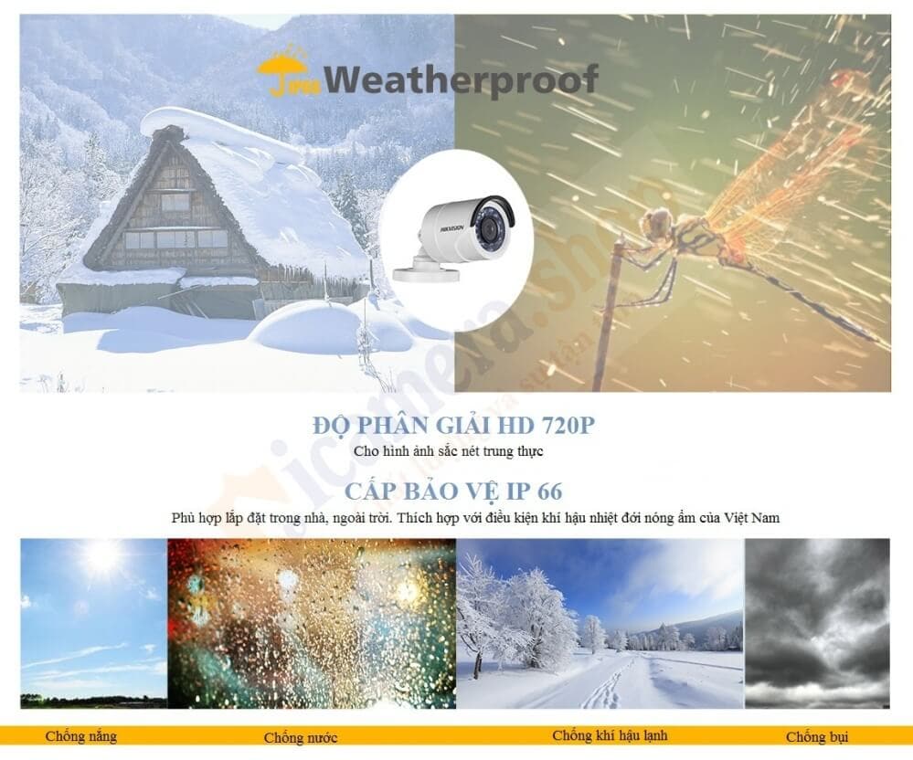 Hikvison DS-2CE16C0T-IR : Với giải nhiệt hoạt động -40-60 độ C , đạt chuẩn chống bụi và nước IP66 cho phép máy hoạt động ổn định trong những điều kiện thời tiết khắc nghiệt .