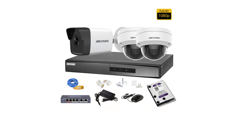 Bộ camera bao gồm 3 mắt camera thân hoặc dome có độ phân giải 2 mp full hd
